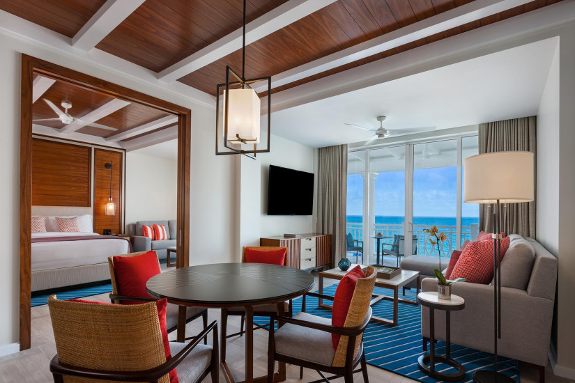 - 91 м2. Роскошный номер состоит из спальни с кроватью king-size и зоной отдыха, просторной гостиной c обеденной зоной, ванной комнаты с ванной и отдельным душем, балкона или террасы с видом на океан. Максимальное размещение - 4 взрослых.