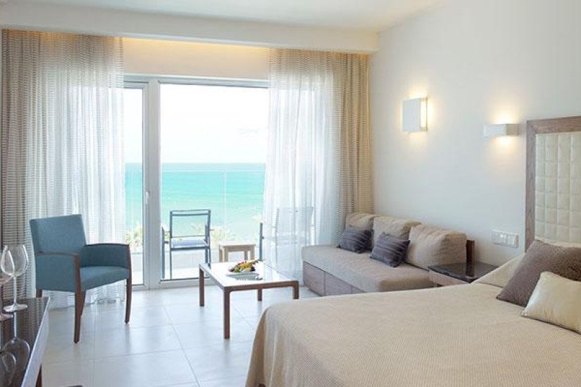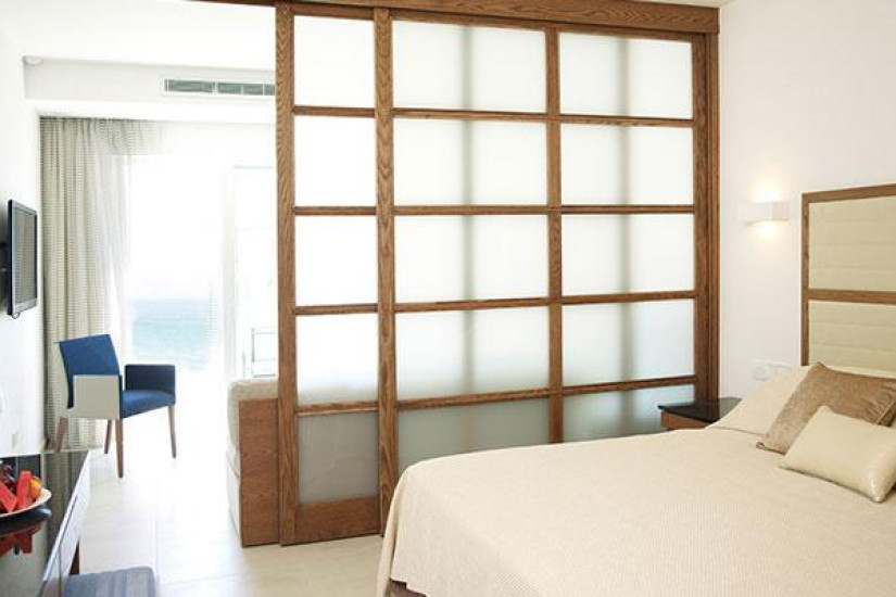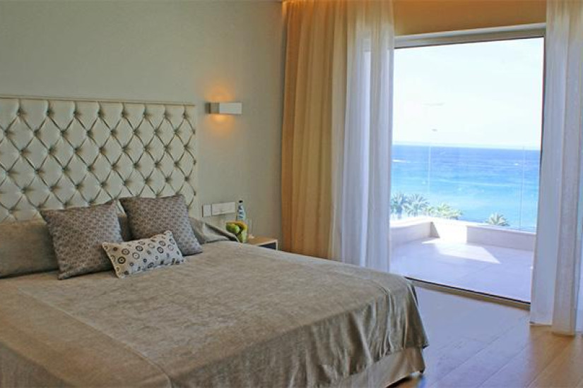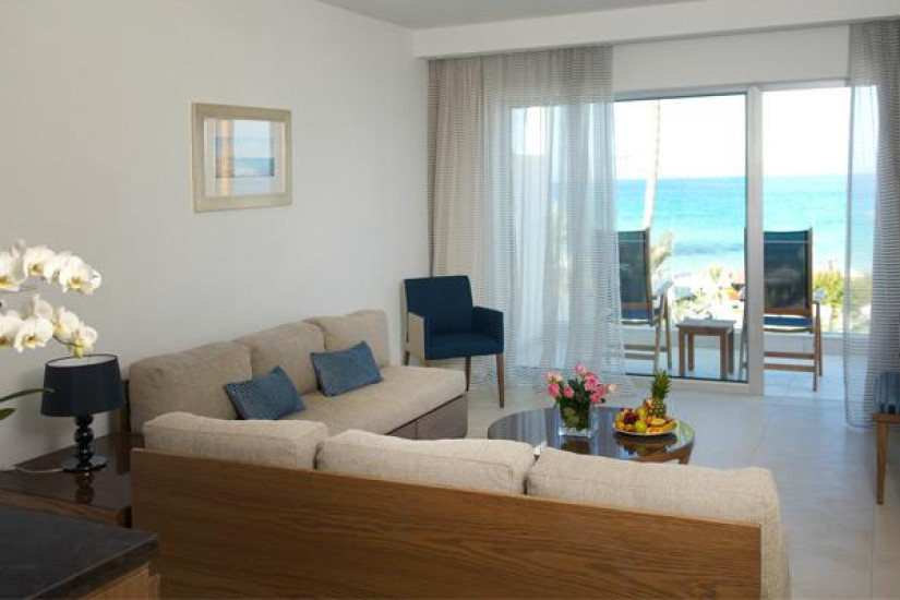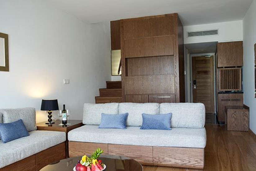- 80 м2. Шикарный номер состоит из двух спален (с кроватью king-size и двумя кроватями twin), просторной гостиной, гардеробной, трех ванных комнат (одна с гидромассажной ванной, и две – с душем), большого балкона с шезлонгами, зоной отдыха и видом на море. Максимальное размещение – 5 человек.