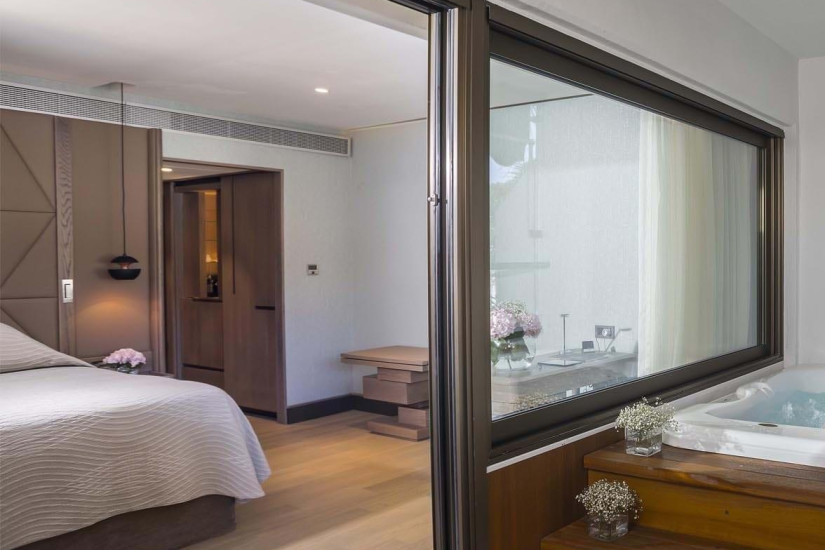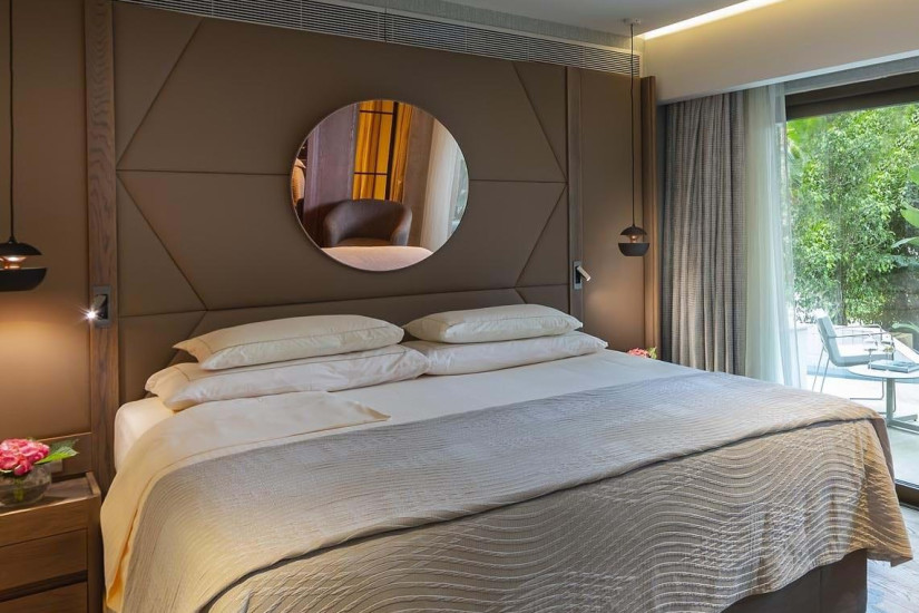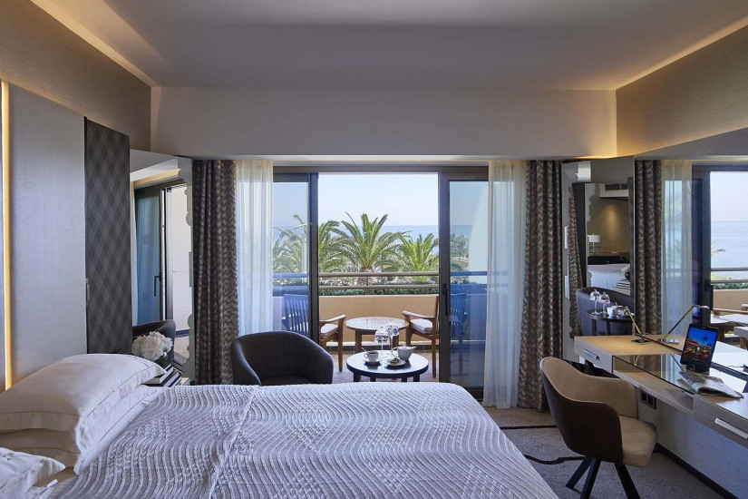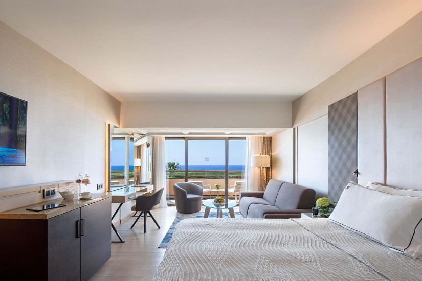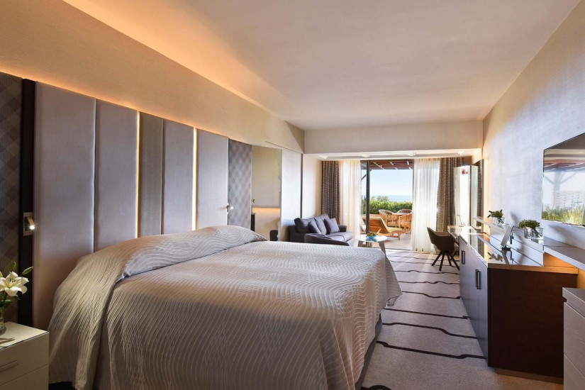 - 39 м2. Состоит из спальни с кроватью king-size или двумя кроватями twin и зоной отдыха с диваном, ванной комнаты с ванной и душем, террасы с зоной отдыха и видом на море. Номера расположены на 1 этаже в главном корпусе. Максимальное размещение – 2 взрослых + 2 ребенка.