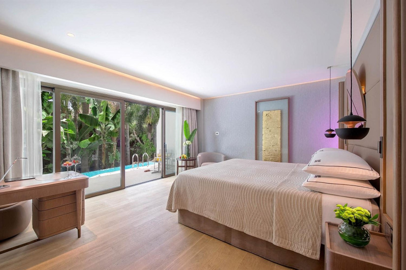 - 39 м2. Состоит из спальни с кроватью king-size или двумя кроватями twin и зоной отдыха с диваном, ванной комнаты с ванной и душем, в некоторых номерах терраса с гидромассажной ванной на открытом воздухе, зоной отдыха. Номера находятся на 1 этаже в корпусе, расположенном рядом с пляжем и садами. Максимальное размещение – 2 взрослых + 2 ребенка.