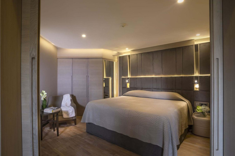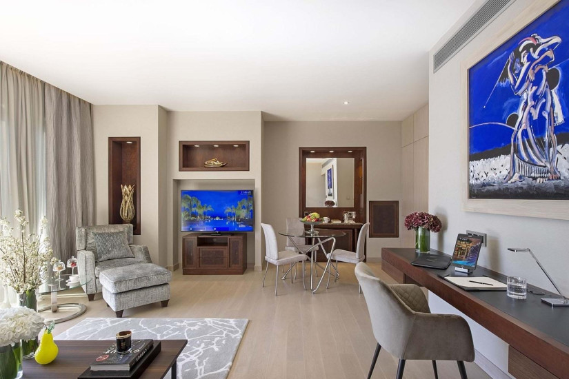 - 90 м2. Состоит из двух спален (с кроватью king-size и двумя кроватями twin), гостиной с диваном, двух ванных комнат с гидромассажной ванной, в некоторых номерах балкон. Номера расположены в главном корпусе. Максимальное размещение – 2 взрослых + 4 ребенка.