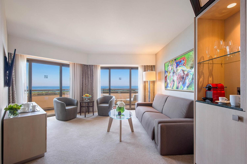 - 57 м2. Состоит из спальни с кроватью king-size, гостиной с диваном и обеденной зоной, ванной комнаты с ванной и душем, в некоторых номерах просторная терраса с зоной отдыха и видом на море. Номера расположены в главном корпусе. Максимальное размещение – 2 взрослых + 2 ребенка.
