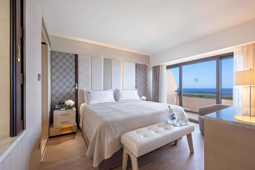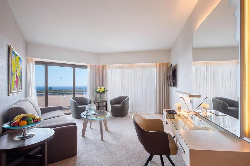 - 77 м2. Состоит из спальни с кроватью king-size, гостиной с диваном и обеденной зоной, гардеробной, ванной комнаты с гидромассажной ванной и душем с эффектом хромотерапии, гостевой туалетной комнаты, в некоторых номерах двойной балкон с панорамным видом на море. Номера расположены на верхнем 6 этаже в главном корпусе. Максимальное размещение – 2 взрослых.