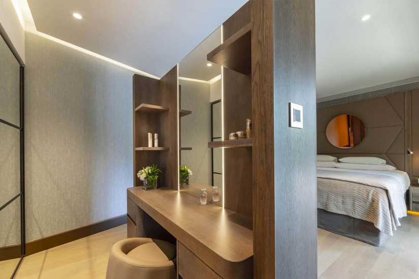 - 77 м2. Состоит из спальни с кроватью king-size, гостиной, гардеробной, ванной комнаты с гидромассажной ванной и душем с эффектом хромотерапии, в некоторых номерах балкон. Номера расположены в главном корпусе, на верхних этажах в крыле для взрослых. Максимальное размещение – 2 взрослых. Гостям номера предоставляются дополнительные услуги.