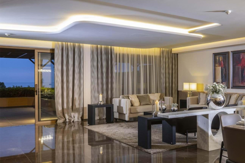 - 240 м2. Состоит из двух спален, гостиной с обеденной зоной и кухней, гардеробных, двух ванных комнат, гостевой туалетной комнаты, балкона с зоной отдыха, обеденной зоной и панорамным видом на море. Номера расположены в отдельном корпусе. Максимальное размещение – 2 взрослых + 3 ребенка.