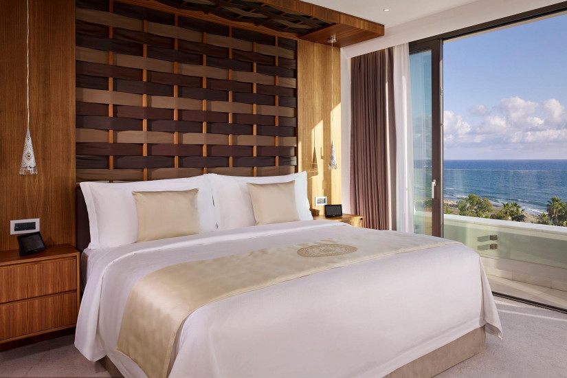 - 95-115 м2. Роскошный номер состоит из спальни с кровать king-size, гостиной, ванной комнаты, гостевой туалетной комнаты, балкона с видом на море. Максимальное размещение – 2 взрослых + 1 ребенок старше 12 лет.