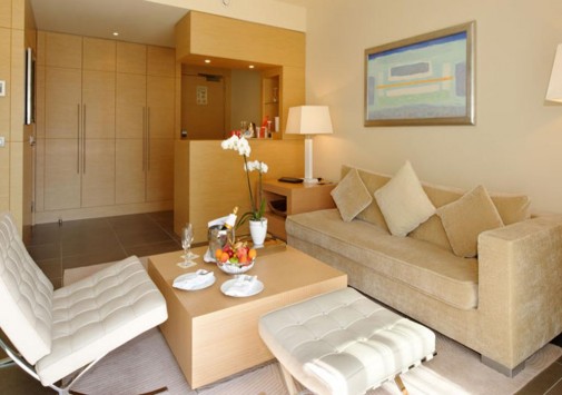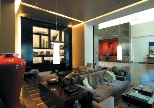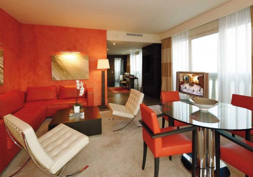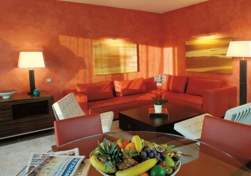 Гармонию внутреннего убранства образует искусный контраст меблировки из дерева венге и полов, облицованных песчаником. Комнаты выдержаны в теплых красных, бежевых и светло-коричневых тонах и отделаны мрамором и деревом.