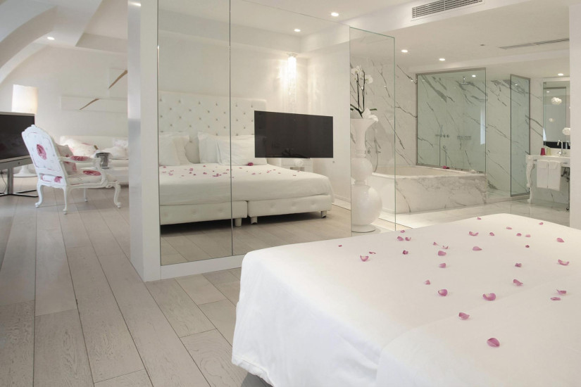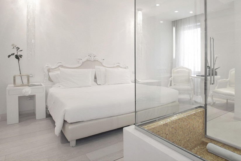 - 80 м2. Расположен на 6 этаже исторического здания. Роскошный номер оформлен в элегантном современном стиле. Благодаря использованию в декоре интерьера стекла и мрамора, а так же цвета слоновой кости и оттенков белого в номере создается ощущение воздушности. Состоит из гостиной с рабочей зоной, гардеробной, спальни и ванной комнаты с душем и ванной.