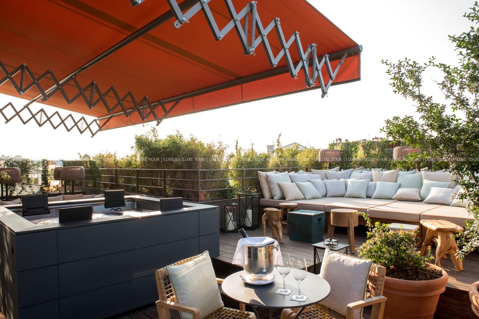 • В изысканном ресторане подают средиземноморские деликатесы от известного шеф-повара Адама Бентала. В теплую погоду превосходными блюдами можно насладиться на живописной террасе с панорамным видом на Париж.