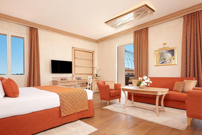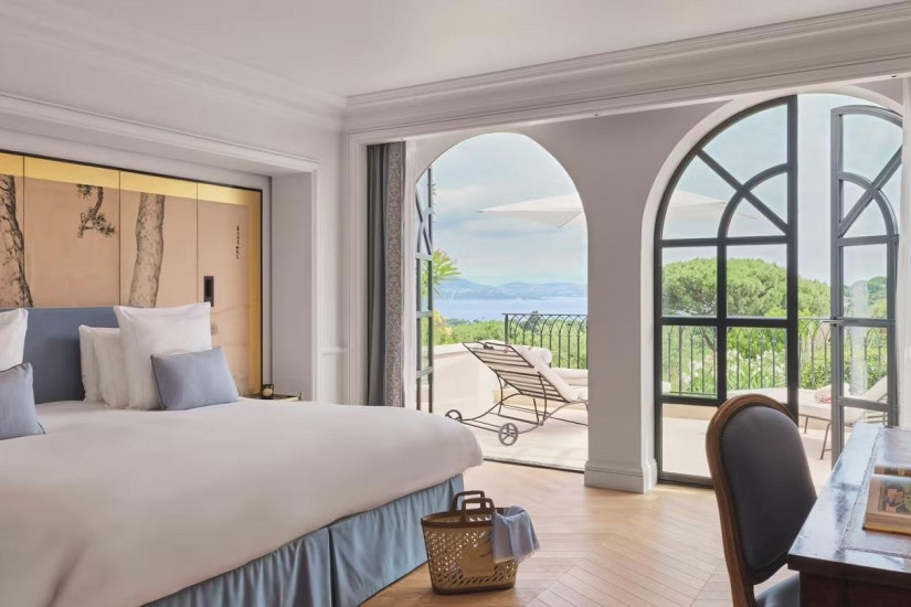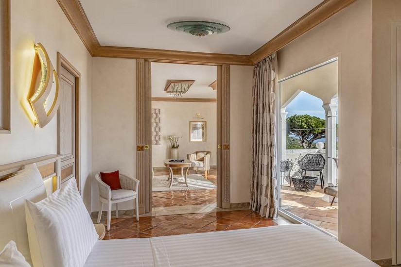 - 60 м2. Состоит из спальни с кроватью king-size, гостиной, гардеробной, ванной комнаты с ванной, оснащенной эффектом хромотерапии, и душем, террасы с шезлонгами, зоной отдыха и панорамным видом на залив Пампелон. Номера расположены в южных башнях шато. Максимальное размещение – 2 человека.