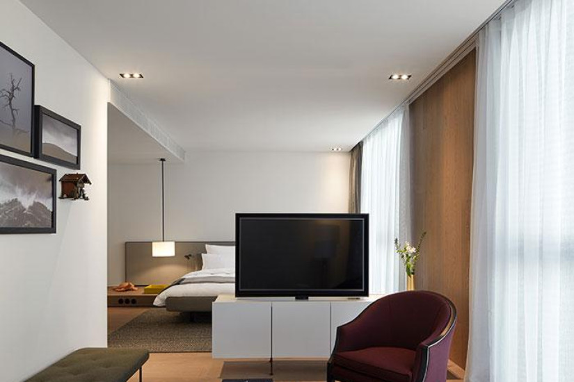 - 50 м2. Состоит из спальни с кроватью king-size, гостиной зоны с диваном, ванной комнаты с ванной и ливневым душем.