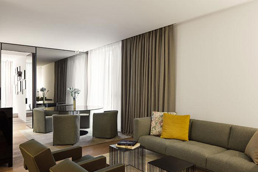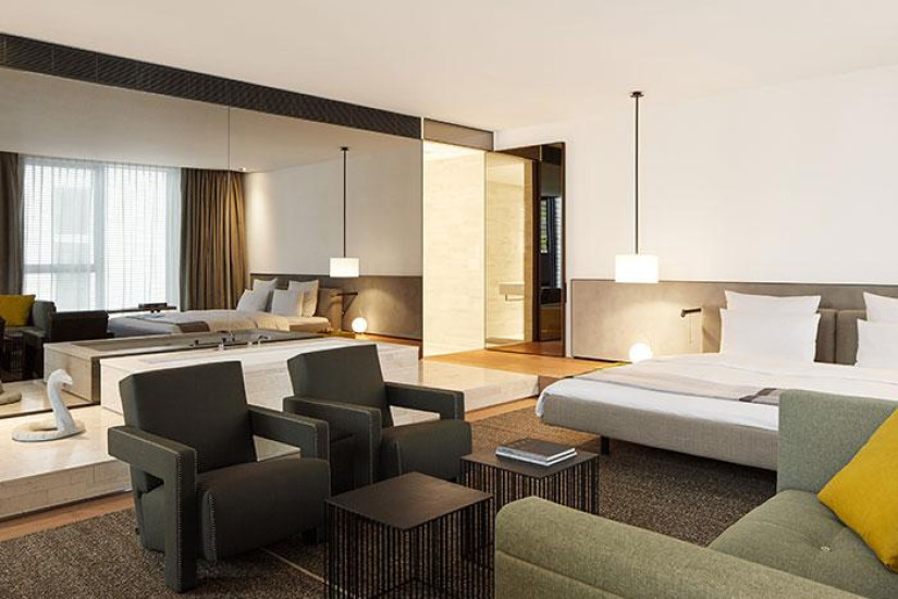 - 78 м2. Состоит из спальни с кроватью king-size и ванной, установленной в комнате, просторной гостиной с обеденной зоной и зоной отдыха с диваном, ванной комнаты с ливневым душем, гостевой туалетной комнаты.