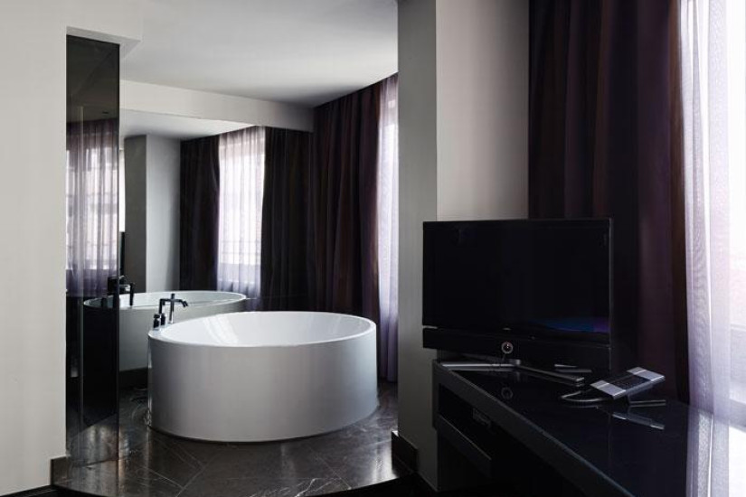 - 32 м2. Состоит из спальни с кроватью king-size и круглой ванной, установленной в комнате, ванной комнаты с ливневым душем. Вид на город.