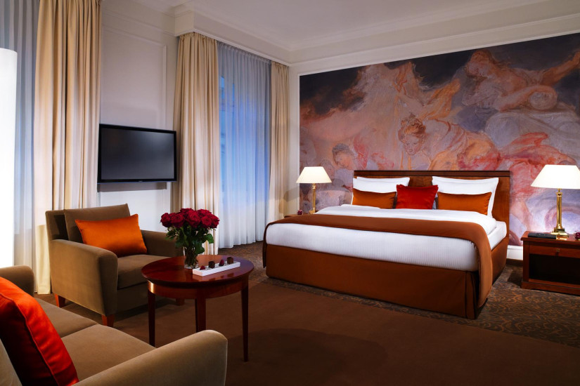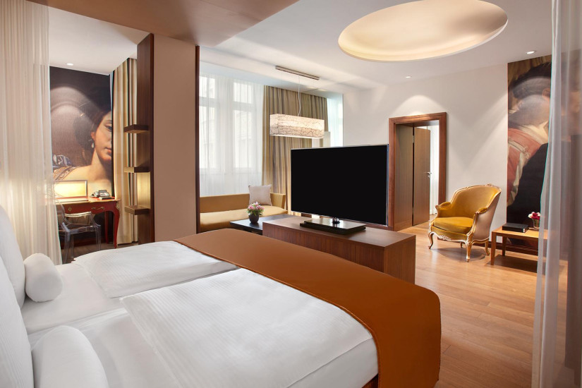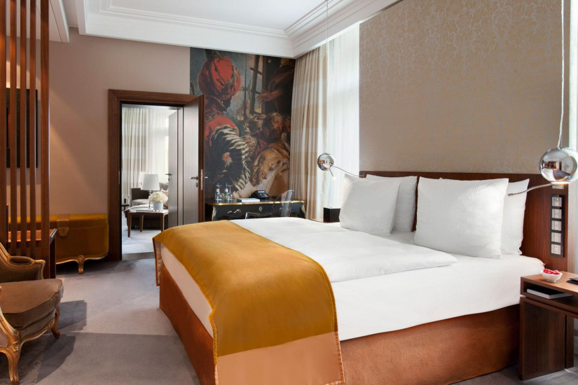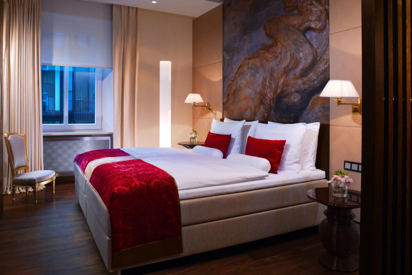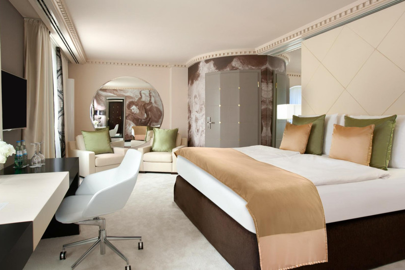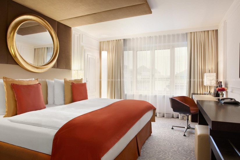 - 45-54 м2. Изысканный номер, украшенный настенной росписью в барочном стиле и антикварной мебелью, состоит из спальни с кроватью king-size или двумя кроватями twin, гостиной и рабочей зоны, гардеробной, просторной ванной комнаты с ванной и отдельным душем. Вид на улицу или во внутренний двор отеля. Максимальное размещение - 3 человека.