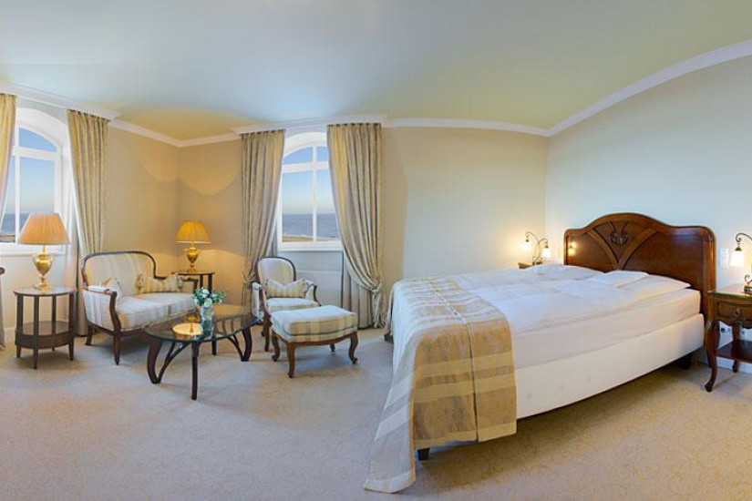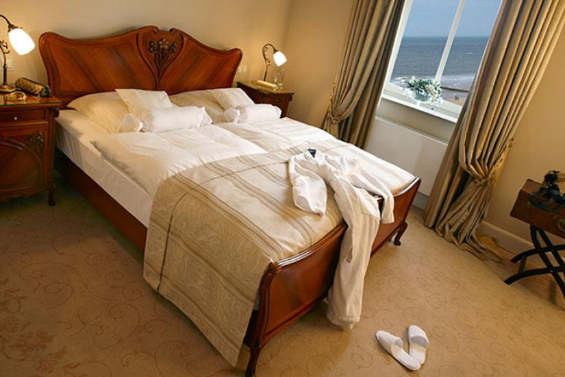 - Отель располагает номерами различных категорий, включая Guest Room и Suite. Номера воссоздают элегантную обстановку начала XX века, обставлены изящной мебелью и украшены изысканными произведениями искусства, из окон открывается прекрасный вид на Северное море, пляж и живописные пейзажи курорта.