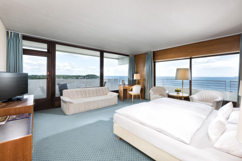 - 30-40 м2. Номер с панорамными окнами состоит из спальни с зоной отдыха и диваном, ванной комнаты, балкона с потрясающим видом на море, пляж, набережную реки Траве и местечко Любек в пригороде Травемюнде.