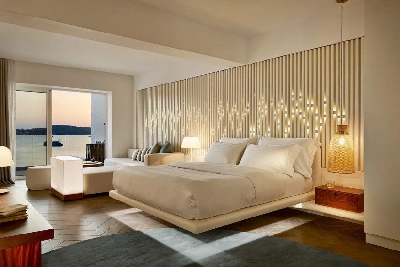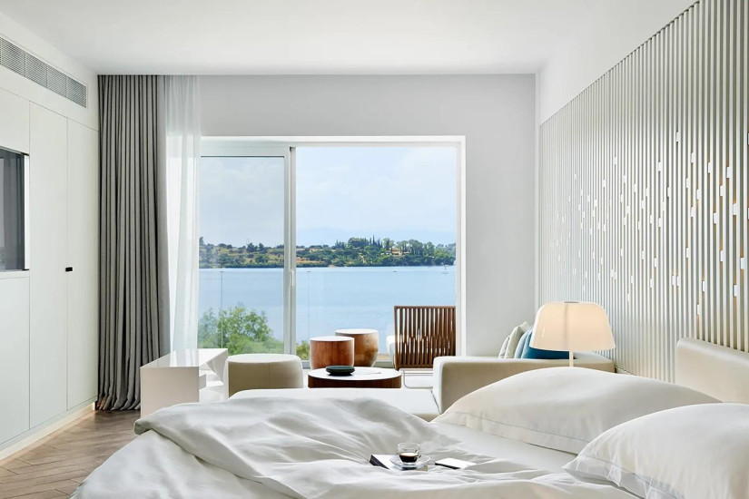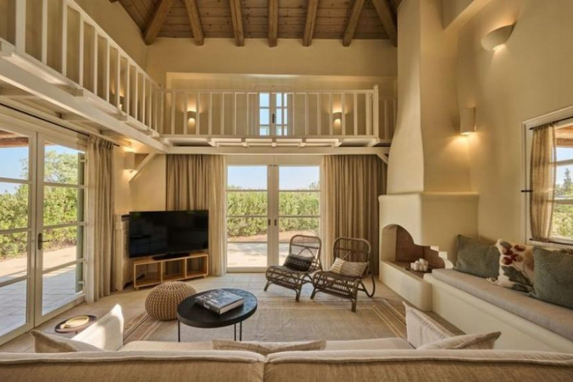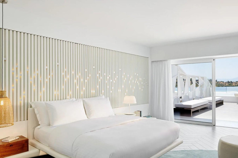 - 145 м2. Состоит из спальни с кроватью king-size или двумя кроватями twin, гостиной, ванной комнаты с душем, террасы с бассейном, зонами отдыха, видом на залив Порто-Хели и выходом к пляжу и пляжному клубу. Номера расположены на первом этаже. Максимальное размещение – 2 взрослых. Возможно объединение соседних номеров.
