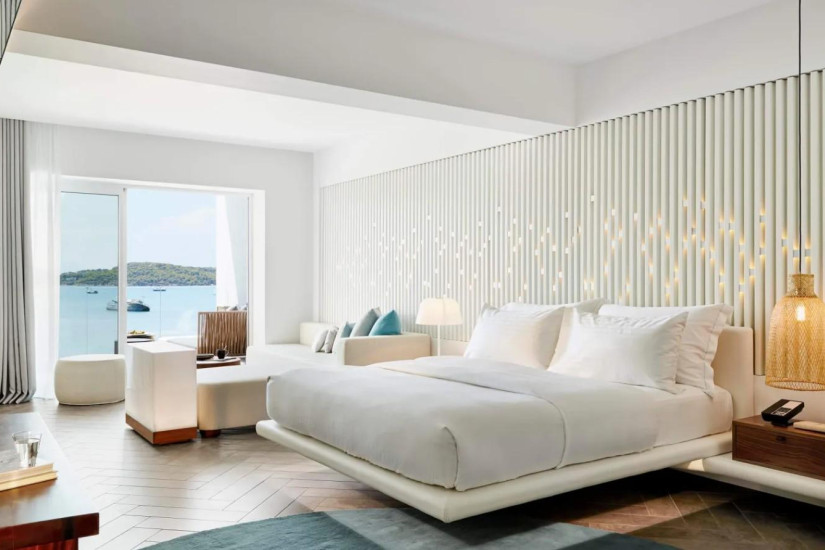 - 65 м2. Состоит из спальни с кроватью king-size или двумя кроватями twin. гостиной зоны с диваном, ванной комнаты с ванной и душем, в некоторых номерах балкон с раздвижными окнами-панелями, зоной отдыха и панорамным видом на залив Порто-Хели. Максимальное размещение – 3 взрослых.
