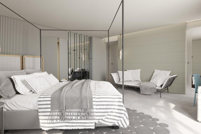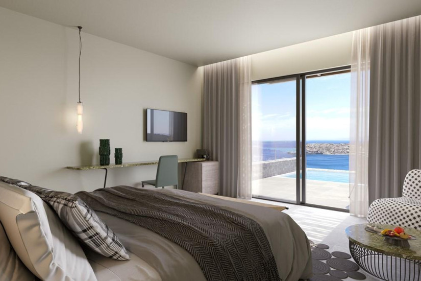 - 66 м2 + терраса 40 м2. Состоит из двух спален с кроватью king-size или двумя односпальными кроватями и зоной отдыха, двух ванных комнат с ливневым душем, террасы с подогреваемым бассейном (15 м2), зоной отдыха и панорамным видом на море. Максимальное размещение – 4 взрослых или 2 взрослых + 2 ребенка.