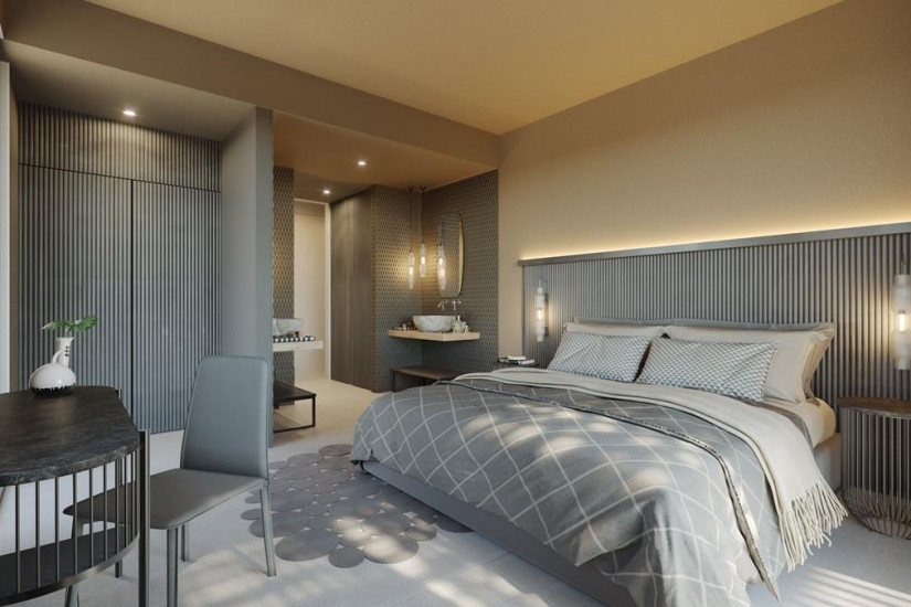 - 33 м2 + терраса 32 м2. Состоит из спальни с кроватью king-size или двумя односпальными кроватями и зоной отдыха, ванной комнаты открытого плана с ливневым душем, террасы с подогреваемым бассейном (15 м2), зоной отдыха и панорамным видом на море. Максимальное размещение – 3 взрослых.