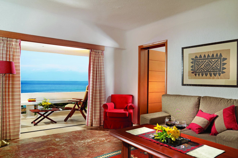 - 300 м2 + внешнее пространство 200 м2. Роскошная двухуровневая вилла состоит из четырех спален, в каждой своя ванная комната и гардеробная, тренажерного зала, большой гостиной с обеденной зоной с кухонным уголком с выходом в собственных сад с частным бассейном с подогревом и приватным выходом на частный отельный песчаный пляж. Вилла через сад может соединяться с 1-bedroom Minoan Royalty Suite с частным бассейном с подогревом. Объединившись номера создают самый большой люкс комплекс на пляже.