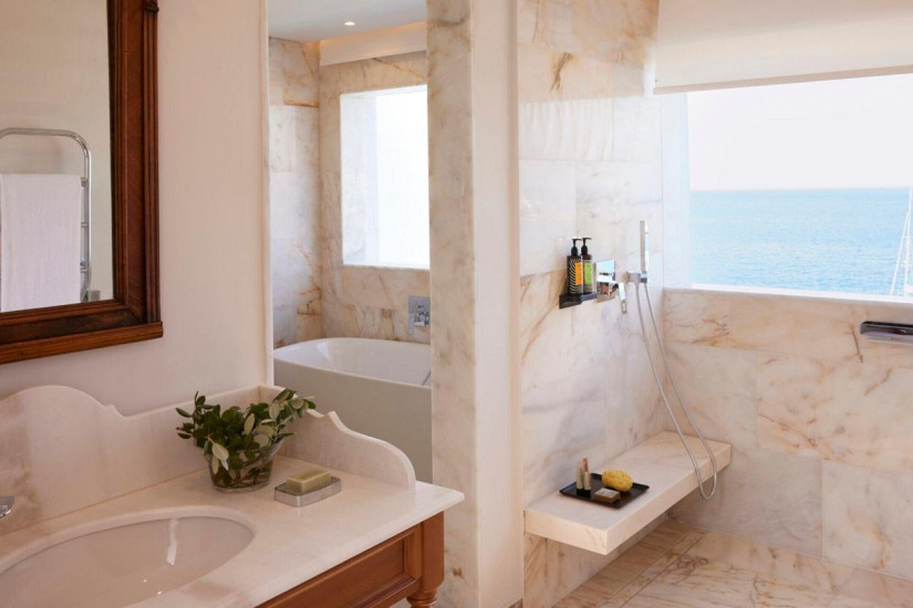 - 80 м2. Состоит из двух спальных комнат, гостиной, двух ванных комнат, смежных со спальнями, гостевой туалетной комнаты. Номер расположен в главном здании отеля с видом на море. Максимально размещение - 5 взрослых.