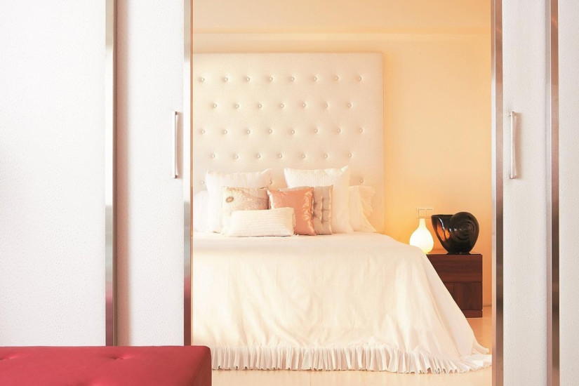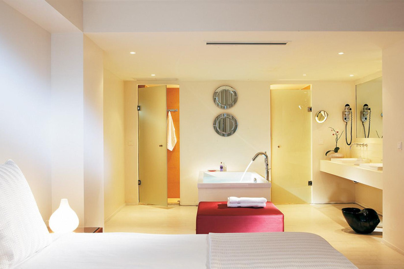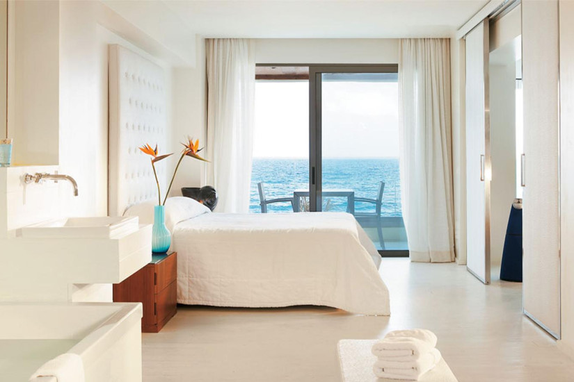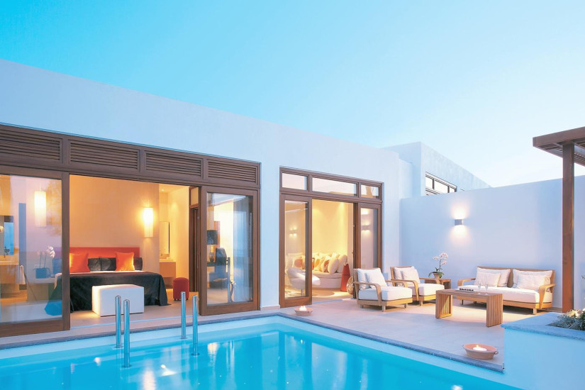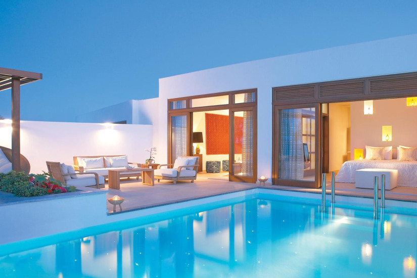 - 45 м2. Состоит из спальни с гостиной зоной, гардеробной, ванной комнаты, меблированной террасы с собственным подогреваемым бассейном и видом на море. Номера расположены в первом ряду у пляжа. Максимальное размещение — 2 взрослых + 1 ребенок.