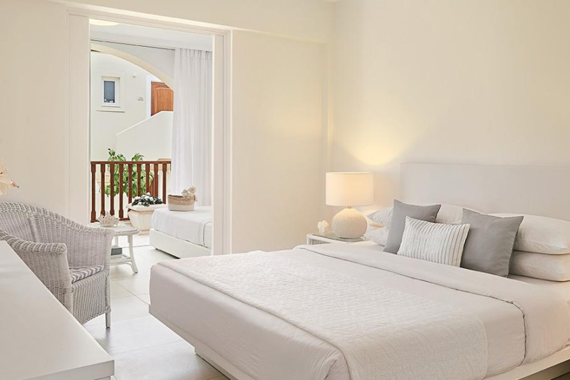 - 40-45 м2. Двухуровневый номер состоит из двух спален (с двуспальной кроватью или двумя кроватями twin и двумя односпальными кроватями), двух ванных комнат с ванной, балкона с боковым видом на море. Номера располагаются в главном корпусе. Максимальное размещение – 3 взрослых + 1 ребенок или 2 взрослых + 2 ребенка.