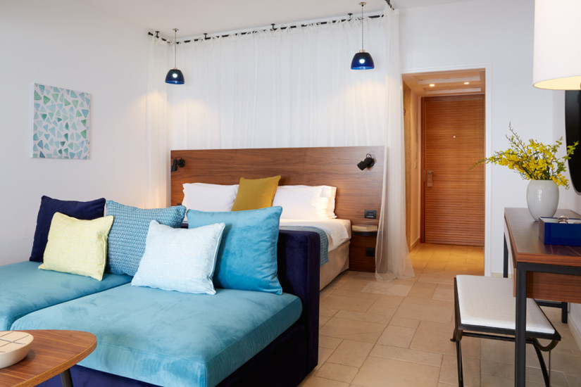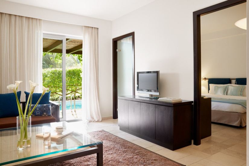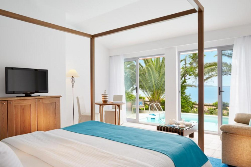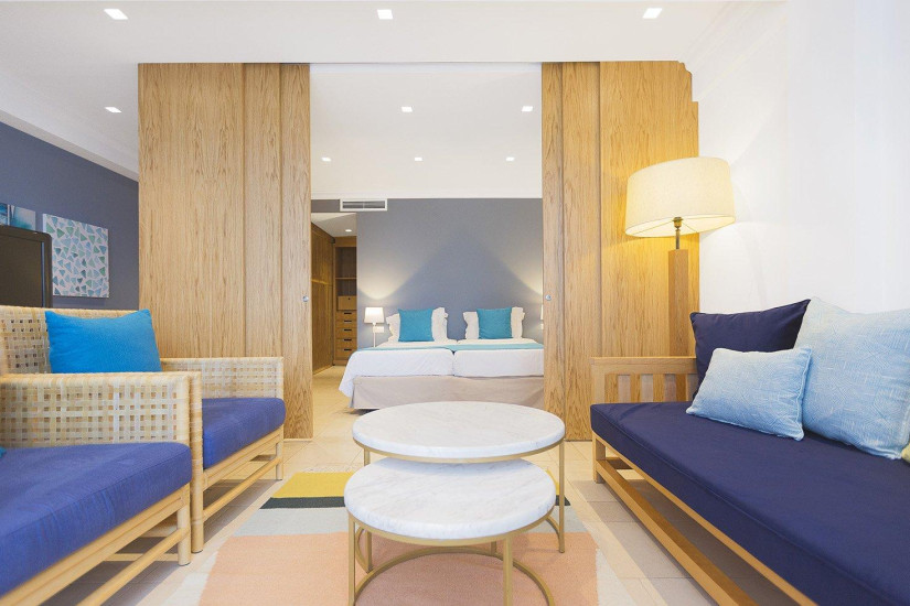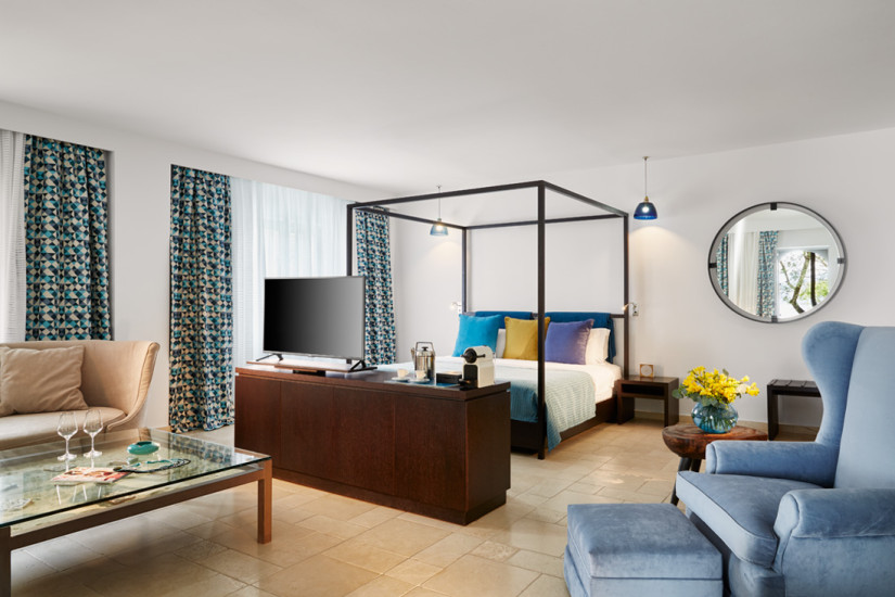 - 50 м2. Состоит из спальни с гостиной зоной, ванной комнаты, просторной террасы с обеденной зоной, шезлонгами и видом на море. Расположен в саду отеля.