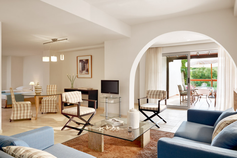 - 40 м2. Идеальный номер для семейного отдыха состоит из просторной спальни, гостиной, которые разделены раздвижной дверью, ванной комнаты, меблированной террасы с видом на сад.