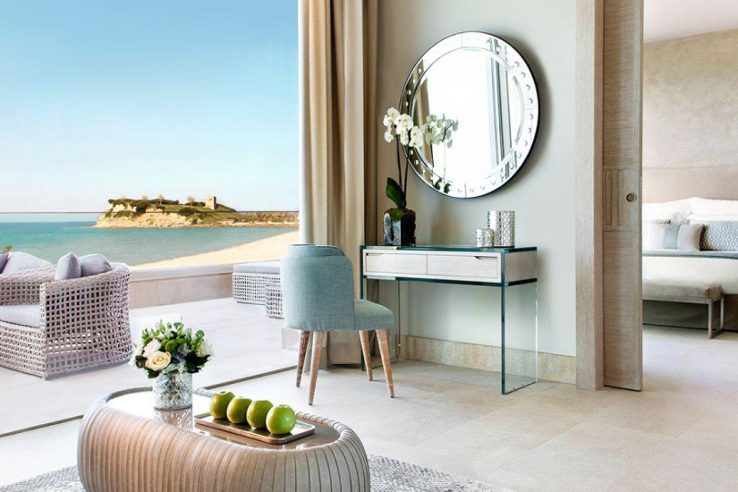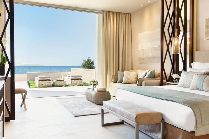 - В отеле 146 номеров разных категорий, включая Guest Rooms и Suites. Просторные номера выдержаны в светлых пастельных тонах, декорированы в элегантном современном стиле и оснащены первоклассными удобствами. С балконов и из панорамных окон номеров открывается великолепный вид на лазурное Эгейское море, пышные сады и сверкающие бассейны.