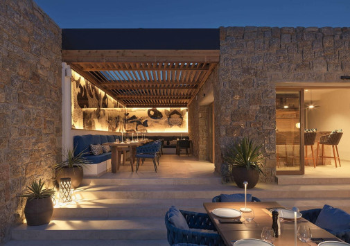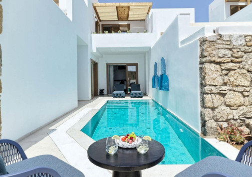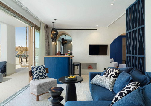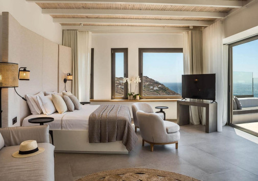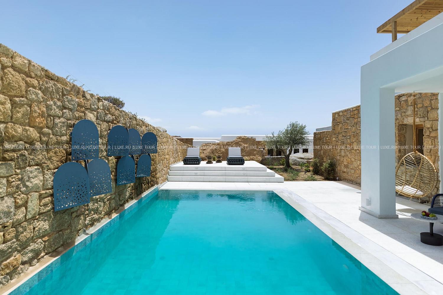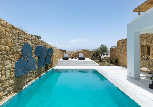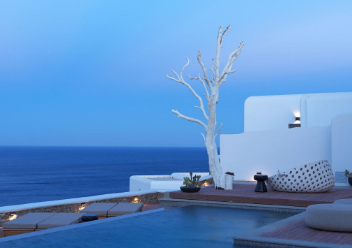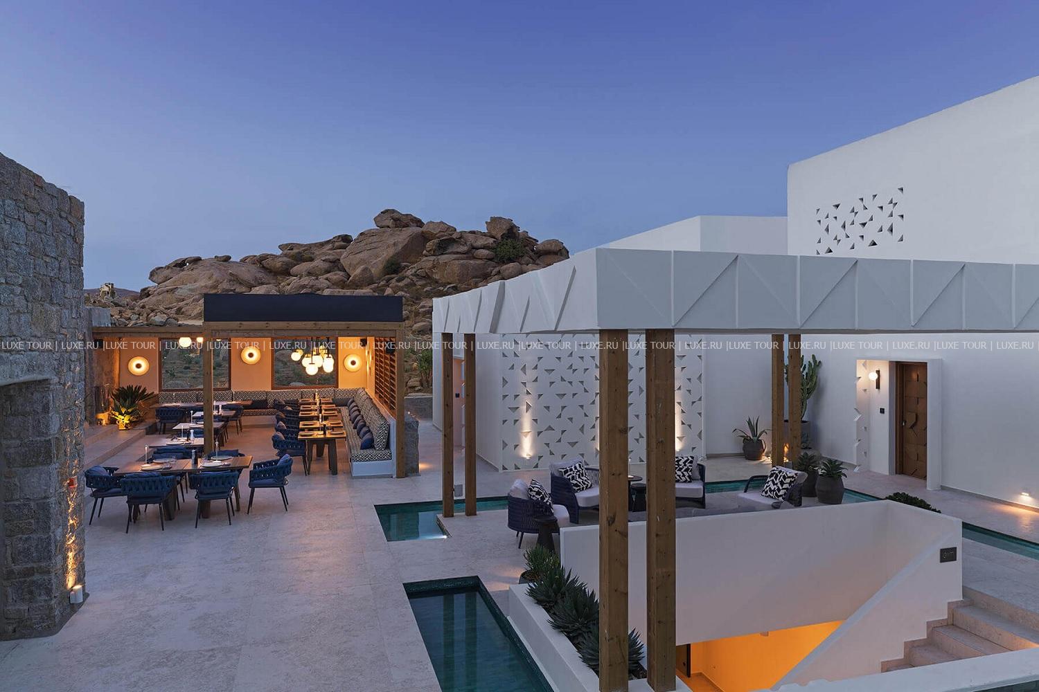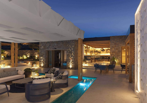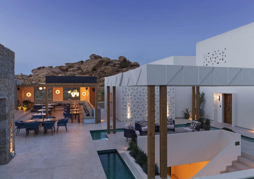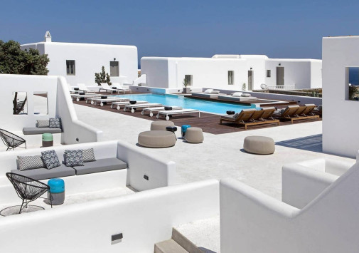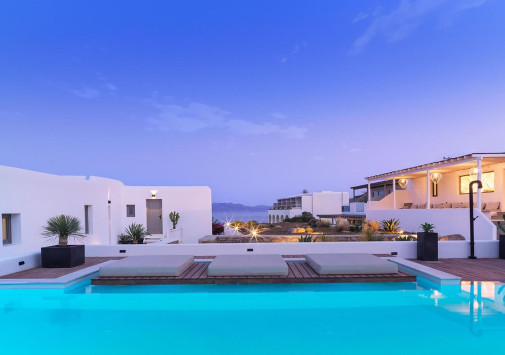 Amyth of Mykonos Super Paradise разместился на вершине холма, с которого открывается фантастический вид на бескрайнюю бирюзу Эгейского моря. Архитектура и интерьеры отеля сочетают современный средиземноморский стиль и аутентичные традиции Миконоса: белоснежные здания с ярко-синими ставнями, отделка из натурального дерева и камня, текстиль с традиционным орнаментом и изделия кикладских мастеров. При этом, гостям предлагается весь спектр высококлассных услуг – от шикарных номеров с персональными бассейнами, греческого ресторана с превосходной кухней и коктейль-бара на панорамной террасе до Spa и фитнес-центров, водного спорта и разнообразия других развлечений. Amyth of Mykonos Super Paradise – райский уголок на популярном курорте Миконоса.