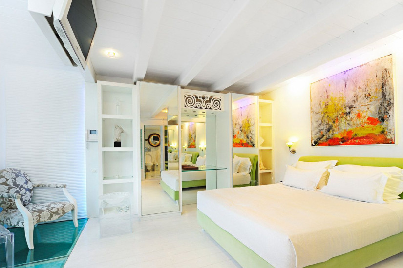 - 26-30 м2. Расположен на нижнем уровне, выдержан в белых тонах, состоит из спальни с двуспальной кроватью (или с двумя отдельными кроватями) и небольшой зоны отдыха, ванной комнаты с гидромассажной ванной или душем. Вид на территорию отеля. Максимальное размещение – 2 человека.