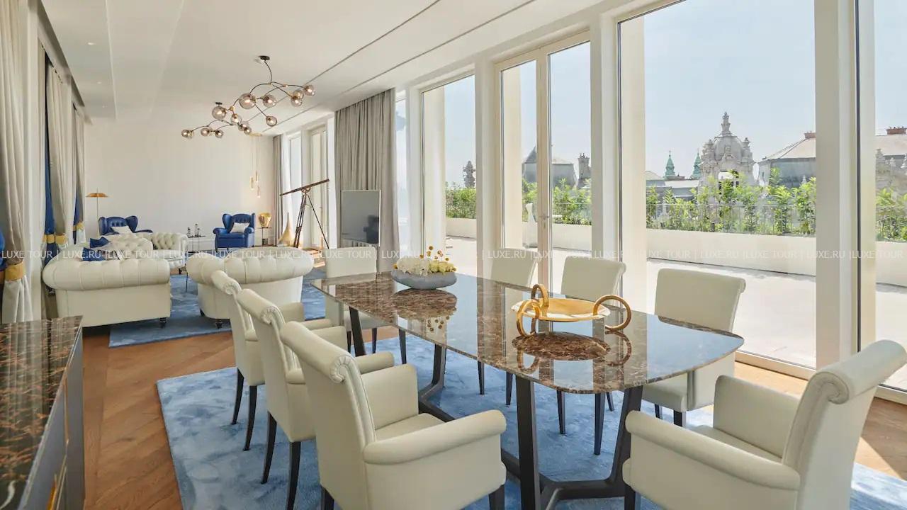 Для гостей – 4 зала для деловых и торжественных мероприятий общей площадью 300 м2, внутренний двор, бизнес-сервис, бесплатный Wi-Fi, парковка, услуги консьержа, услуги прачечной.