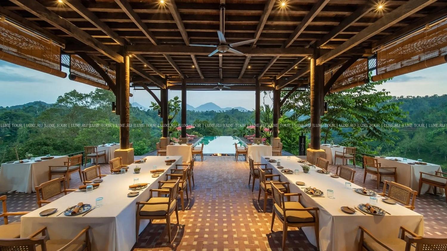 • Ресторан Open Kitchen, с террасы которого открывается потрясающий панорамный вид на джунгли, представляет блюда балийской кухни, приготовленные из местных фермерских продуктов, из которых 70% - растительные ингредиенты.