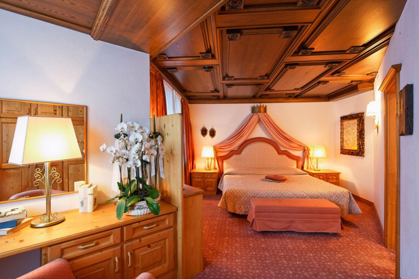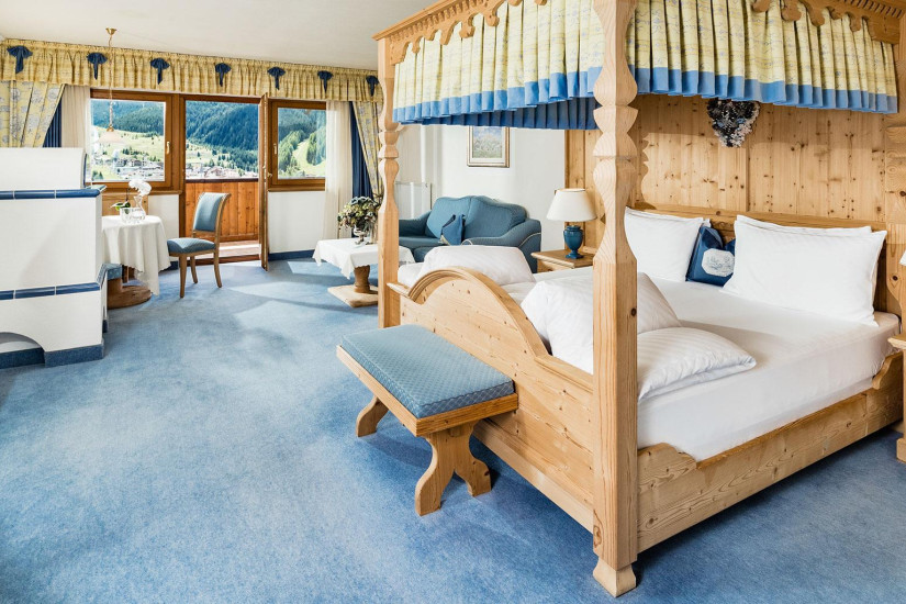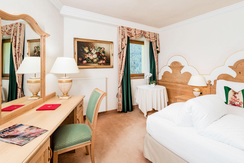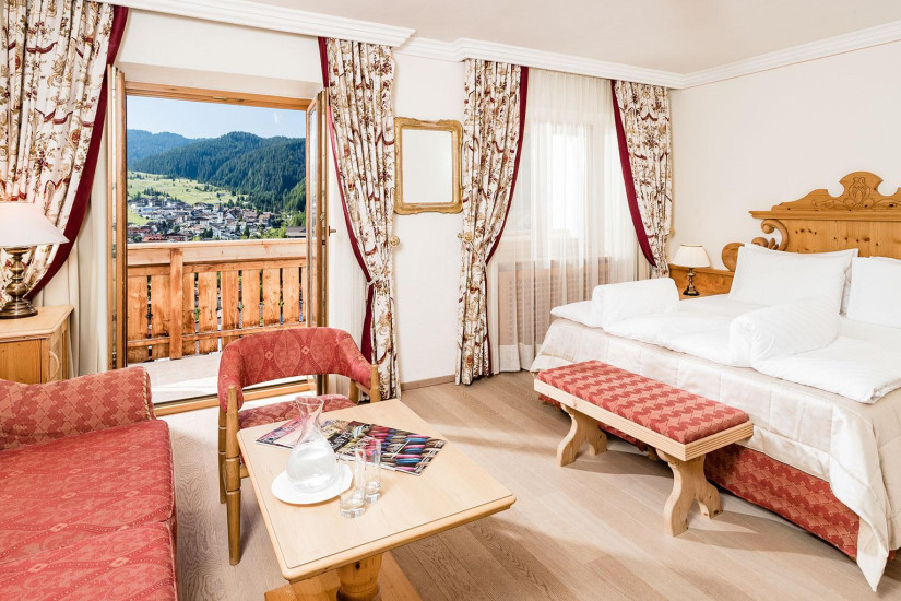 - Отель располагает номерами различных категорий, включая Guest Room и Suite. Номера оформлены в традиционном тирольском стиле, отделаны натуральным деревом, обставлены изящной мебелью и декорированы изысканными тканями с ярким цветочным орнаментом, а из окон и с балконов открывается чудесный вид на Доломитовые Альпы, вершину Сассонгер и живописные пейзажи курорта.