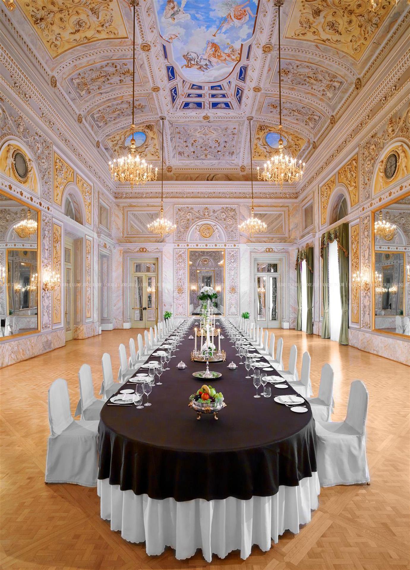 Для гостей — 7 залов для деловых и торжественных мероприятий, вмещающие до 300 человек, бизнес-центр, автомобильная парковка, аренда автомобилей, услуги дворецкого, услуги консьержа, услуги прачечной и химчистки.