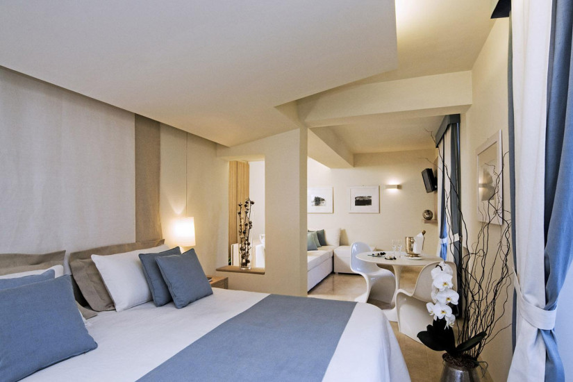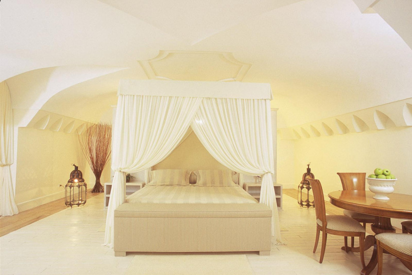 - 80 м2. Шикарный номер в средиземноморском стиле, расположен на верхнем этаже башни XVI века, состоит из спальни с двуспальной кроватью под пологом, гостиной, ванной комнаты, джакузи и душевой кабиной, просторной террасы (120 м2) с джакузи, зоной отдыха и панорамным видом на море. Максимальное размещение — 2 взрослых+1 ребенок.