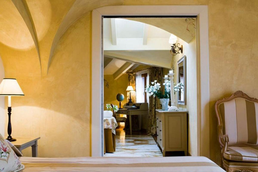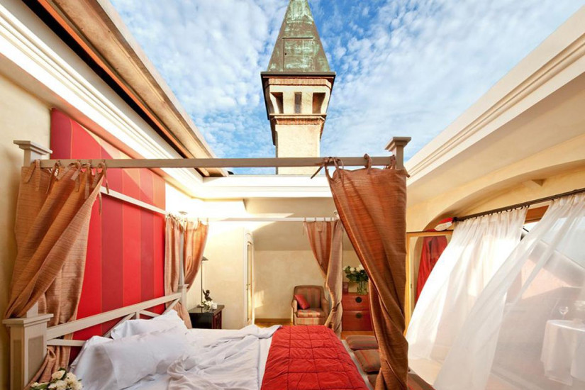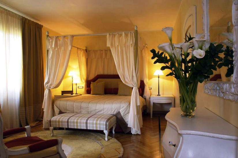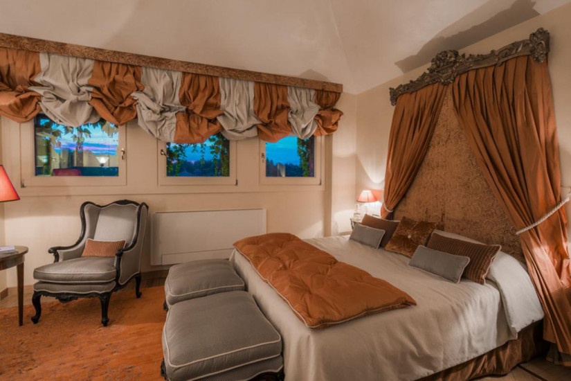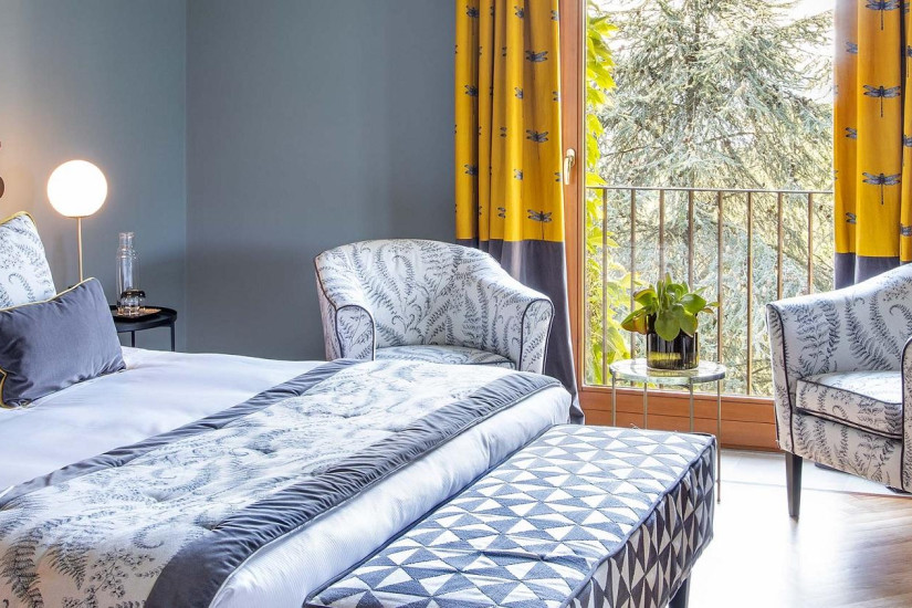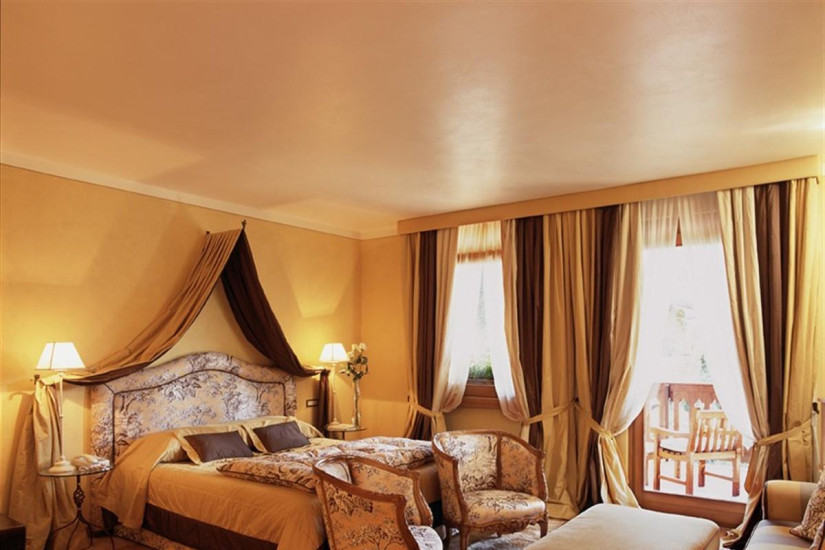- 45 м2. Просторный номер в пастельных тонах, состоит из спальни (в большинстве номеров - с кроватью под пологом), гостиной с диваном, ванной комнаты с гидромассажной ванной и мультифункциональным душем с эффектом сауны и турецкой бани, балкона с видом на парк, виноградники и, в некоторых номерах, на озеро. Максимальное размещение - 3 человека.