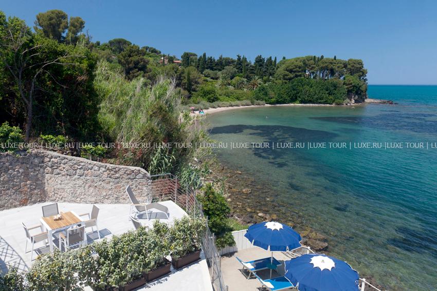 Частный оборудованный песчаный пляж отеля расположен на 2-метрвой возвышенности над морем, куда имеется спуск-лестница.