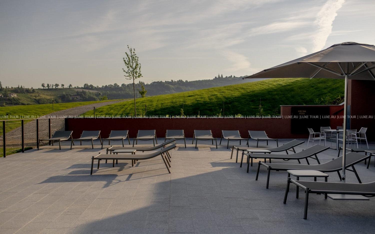 В отеле имеется открытый бассейн с подогревом (28-30°C) и панорамным видом на Альпы и замок Серралунга.