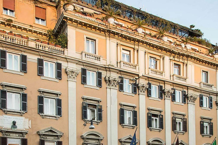- 100 м2. Фешенебельный номер, названный в честь композитора Пьетро Масканьи, состоит из спальни, гостиной, гардеробной, двух ванных комнат, гостевой туалетной комнаты, трех балконов с видом на улицу Виа-дель-Корсо и исторический центр Рима. Номер расположен на основном этаже отеля. Максимальное размещение – 4 человека.
