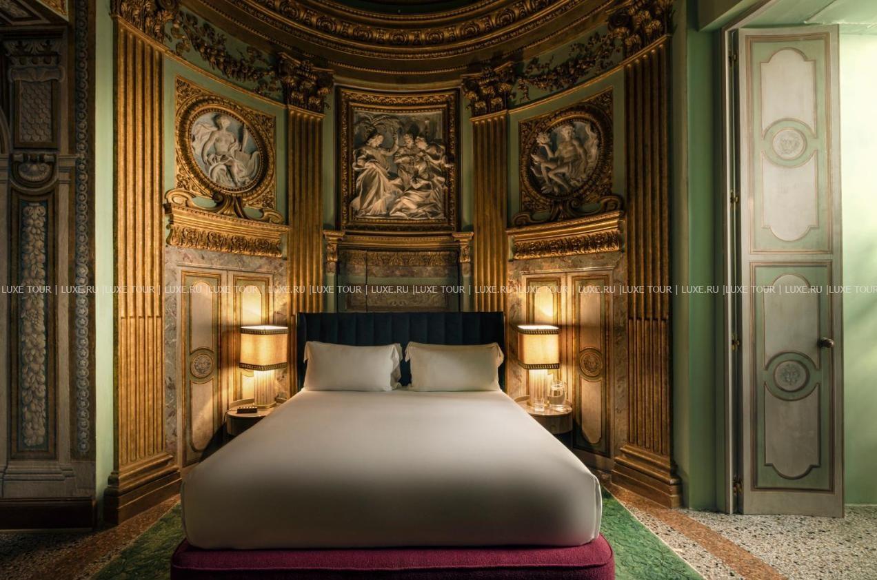 В самом сердце Рима, в нескольких шагах от Испанской лестницы и фонтана Треви находится главная резиденция семьи Боргезе – Палаццо Боргезе, в западном крыле-галерее которого и разместился Palazzo Shedir. В 1678 году принц Джованни Баттиста Боргезе заказал строительство галереи выдающимся творцам итальянского барокко – архитектору Карло Райнальди и живописцу Джованни Гримальди. В результате их творчества появился настоящий шедевр, где сегодня и располагается уникальный отель, переносящий гостей в атмосферу и интерьеры палаццо XVII века: изумительные фрески и лепнина, старинные полотна и скульптуры, мерцание зеркал, позолоты и ценных пород мрамора. Дворцовое великолепие царит в роскошных номерах, залах и салонах отеля, а сервис Palazzo Shedir рассчитан на самых взыскательных гостей.