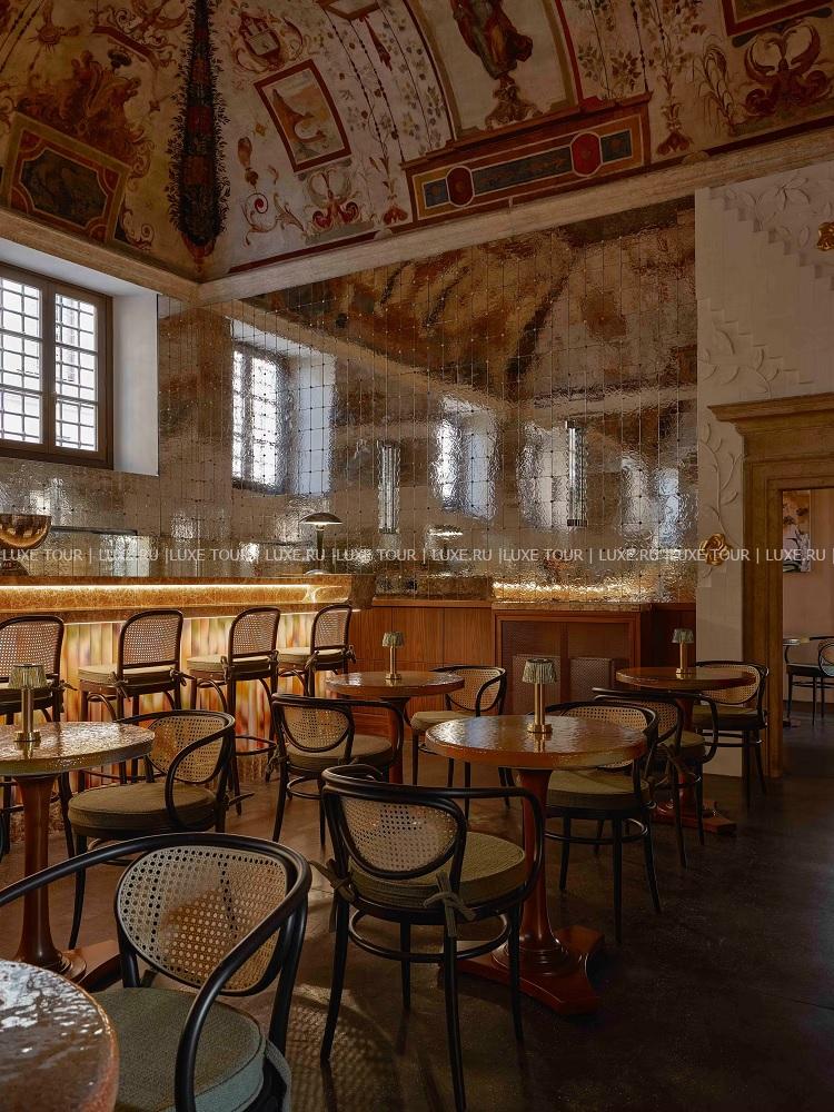 • Уютный бар Della Musa, расположенный в историческом зале с потолочными фресками XVII века, предлагает широкий выбор коктейлей, аперитивов, вин и деликатесных закусок, включая устриц.