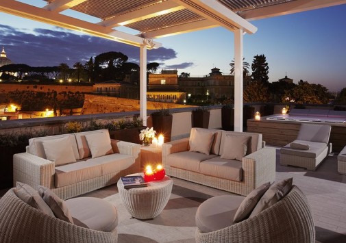 На открытой террасе, расположенной на крыше, приятно отдохнуть, выпить бокал вина и полюбоваться захватывающей панорамой на вечный город.