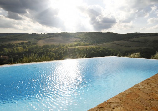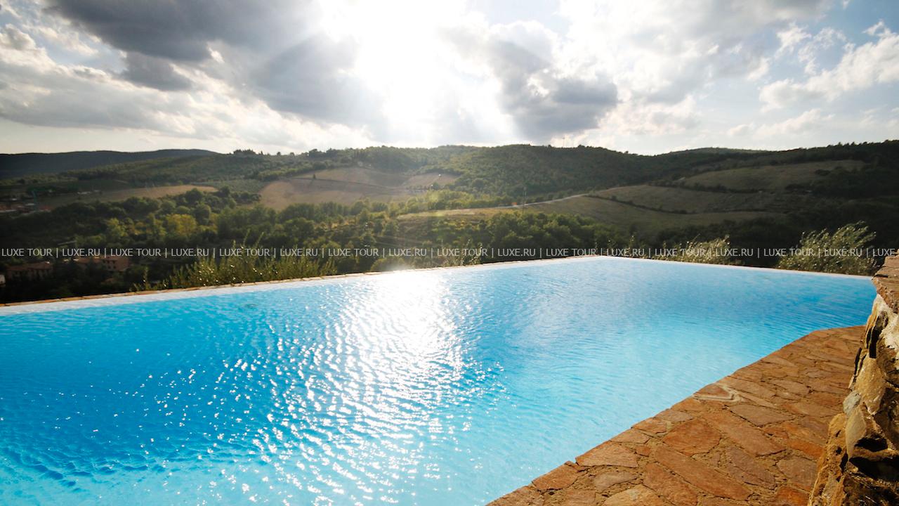 Большой открытый бассейн с панорамным видом на окрестности. Непосредственно в бассейне организуются дегустации вина.