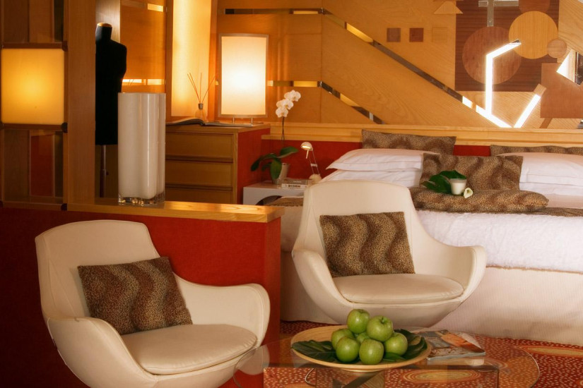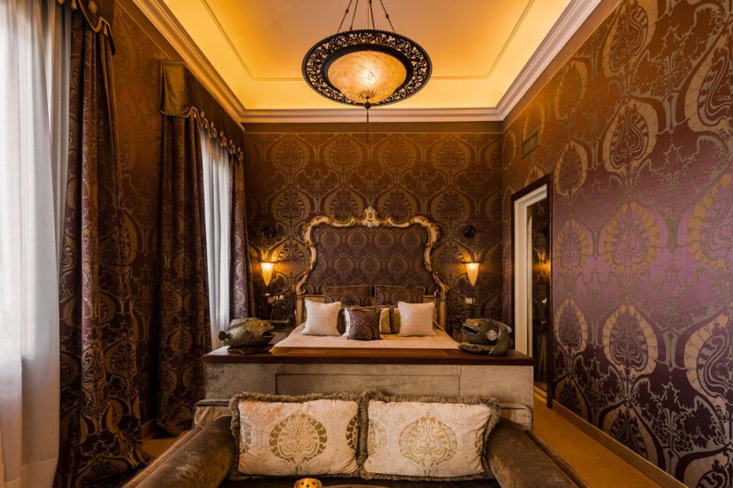 - 30 м2. Роскошный номер в восточном стиле состоит из спальни с двуспальной кроватью, гостиной, ванной комнаты, украшенной мозаикой, с хаммамом, ванной, душем и окном. Панорамный вид на Венецианскую лагуну и остров Сан-Джорджо. Номер расположен на верхнем этаже в центральной части здания.