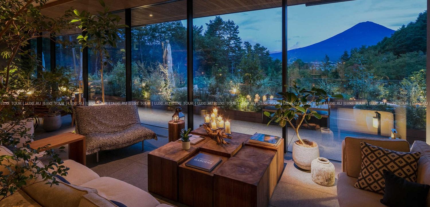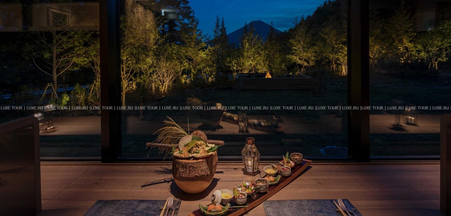 - Элегантный ресторан Yamanoha с открытым очагом, отделкой из местного дерева и камня, панорамными окнами и видом на озеро и Фудзияму представляет традиционную японскую кухню в подаче кайсэки.