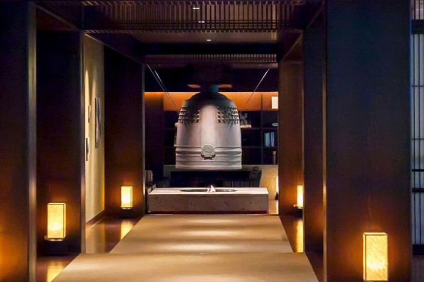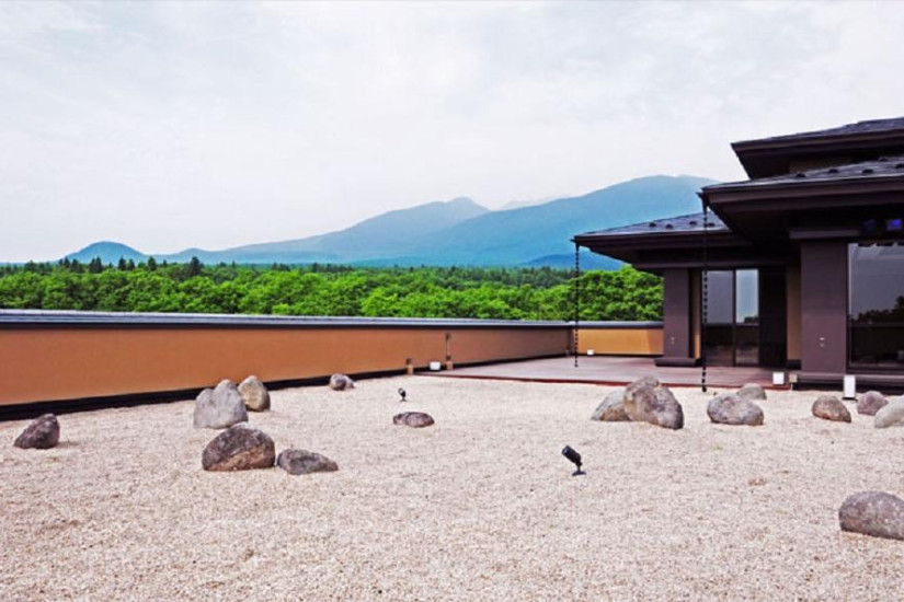 - 112 м2. Номер в японском стиле состоит из спальни с двумя кроватями twin, гостиной с очагом «ирори» в полу и обеденной зоной, гардеробной, ванной комнаты с деревянной ванной у окна и душем, гостевой туалетной комнаты, террасы с ванной-онсен на открытом воздухе, японским садом и панорамным видом на горы. Номер расположен на верхнем этаже.