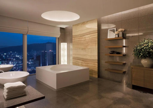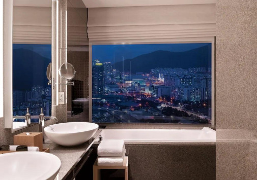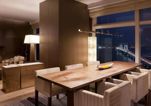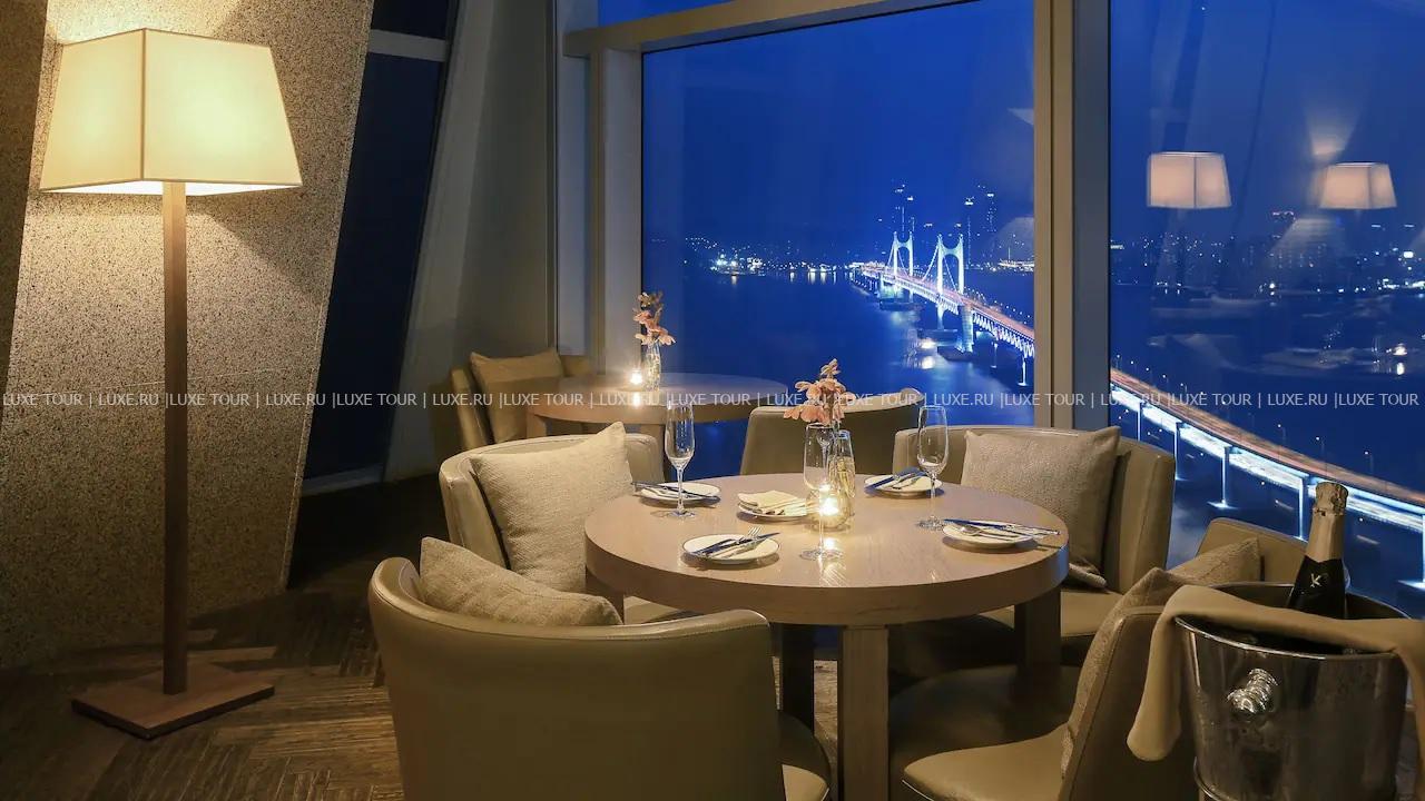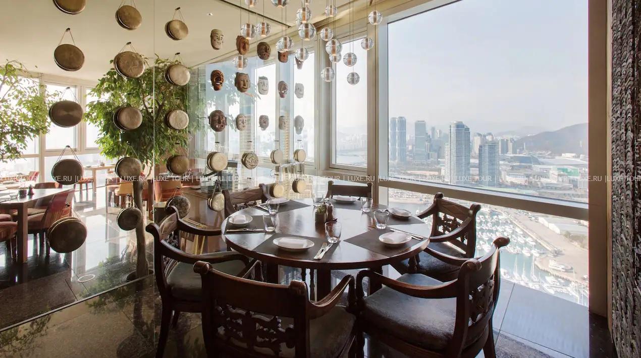 - Ресторан Dining Room, Steak & Seafood Grill, расположенный на 32 этаже, откуда открывается захватывающий вид на море и город, работает в концепции «открытой кухни» и предлагает деликатесы из мяса и морепродуктов, приготовленные на гриле, а также современную интерпретацию аутентичных корейских блюд.